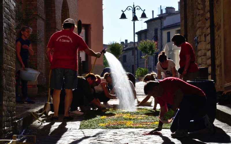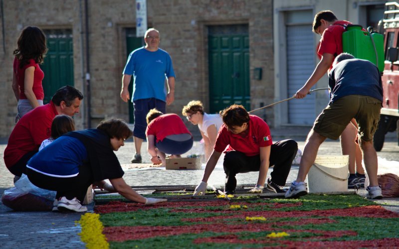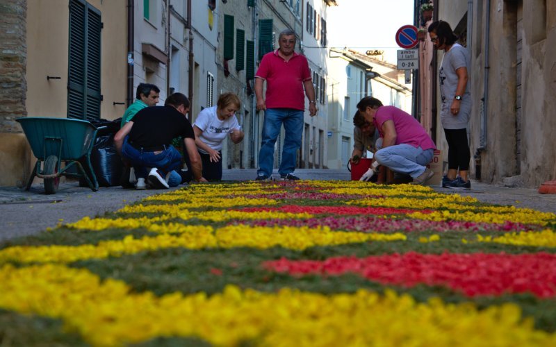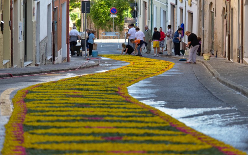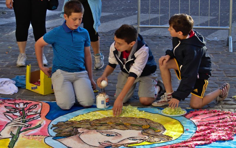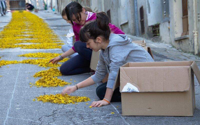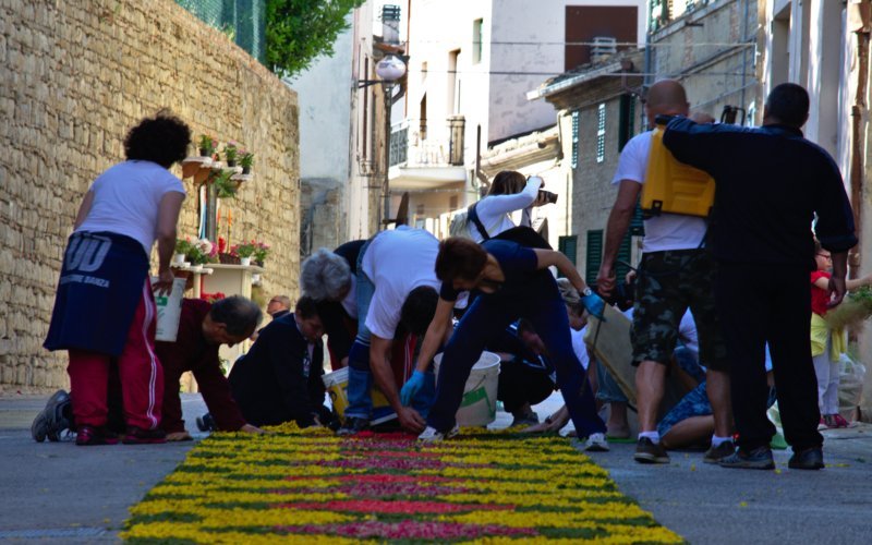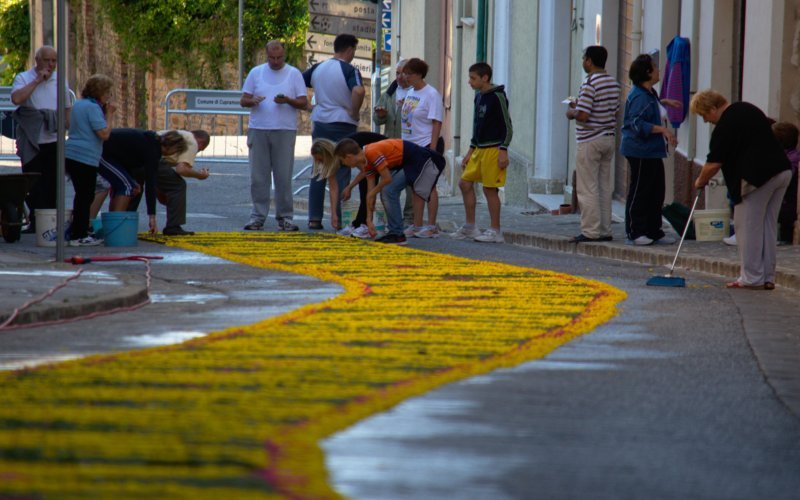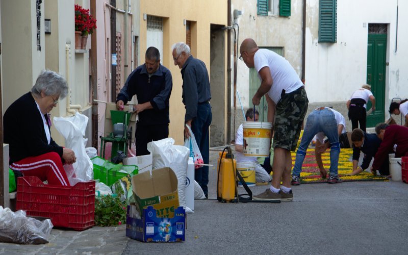 Die Infiorata-Tradition stammt aus der Nachkriegszeit und ist direkt mit der Tradition der Bruderschaft des Heiligen Sakraments verbunden. Tatsächlich breiteten die Kinder Blütenblätter von Landblumen aus, bevor der Priester das Heilige Sakrament trug.