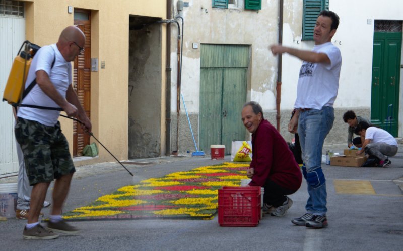 Die Zeichnungen werden von Schülern unter Aufsicht ihres Kunstlehrers angefertigt. Diese Entwürfe werden dann den Leitern der verschiedenen Stadtteile präsentiert und sie wählen die schönsten und realisierbarsten aus. Der nächste Schritt wurde den Handwerkern anvertraut, die maßstabsgetreue Formen aus Holz und Eisen herstellen. Dann werden die Blumenteppiche am frühen Sonntagmorgen mit Hilfe der Bevölkerung in den Hauptstraßen von Cupramontana gelegt.