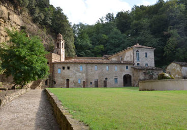 Am Ende des kleinen Aufstiegs erscheint die Belohnung, der Eremo dei Frati Bianchi, die Einsiedelei der Weißen Brüder, in der die ersten Einsiedler im Jahr 1200 einst in selbst gegrabenen Höhlen lebten. Sie trugen weiße Gewänder und gehörten dem Orden von Camaldoli an. Am Ende des Tals befindet sich das vom Mönchsarchitekten Don Appolonio Tucchi entworfene Kloster aus dem 18. Jahrhundert mit dem schönen Glockenturm vor der Felswand, dem Kreuzgang mit Sonnenuhr und anderen versteckten Details.