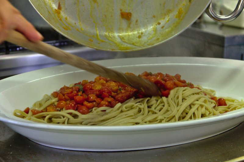 Der Workshop endet mit einem gemeinsamen Essen, bei dem die gemeinsam zubereitete Pasta serviert wird. Manchmal bietet Carla einen Salat aus Wildpflanzen und essbaren Blumen oder leckeres hausgemachtes Eis.